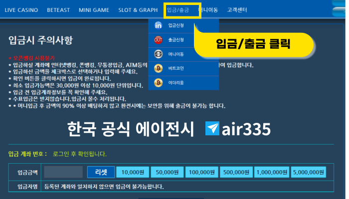 상단 사진 입금/출금 메뉴 카테고리를 클릭 하시면 바로 입금하는 계좌 창이 보입니다.